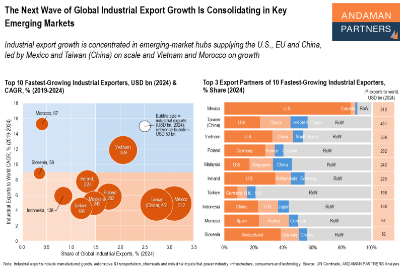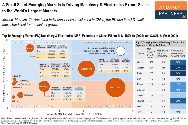 Mexico, Vietnam, Thailand and India anchor export volumes to China, the EU and the U.S., while India stands out for the fastest growth.