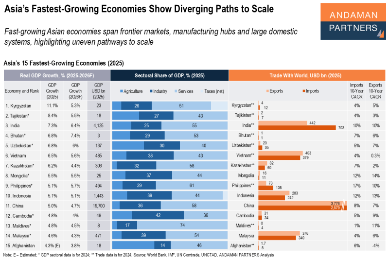 Fast-growing Asian economies span frontier markets, manufacturing hubs and large domestic systems, highlighting uneven pathways to scale.