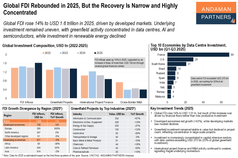 Investment remained uneven, with greenfield activity concentrated in data centres, AI and semiconductors, while investment in renewable energy declined.