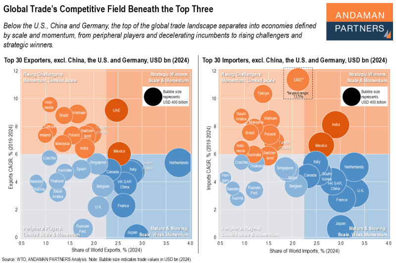 The top of the global trade landscape separates into economies defined by scale and momentum.