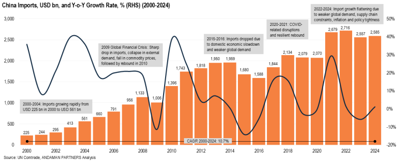 From 2000 to 2024, China’s imports had a CAGR of 10.7%, with peak year-on-year growth rates of 36% in 2004, 25% in 2011 and 30% in 2021. From 2014 to 2024, the CAGR was more muted at 3%. After annual imports surpassed USD 2 trillion in 2018, China’s yearly import growth rates were flat in 2019 and 2020, before growing by 30% in 2021 and surpassing USD 2.6 trillion amid the post-COVID recovery in global demand. Imports reached a record high of USD 2.7 trillion in 2022, and hovered around USD 2.5 trillion in 2023-2024, with a 6% annual decrease in 2023 and a 1.1% increase in 2024.