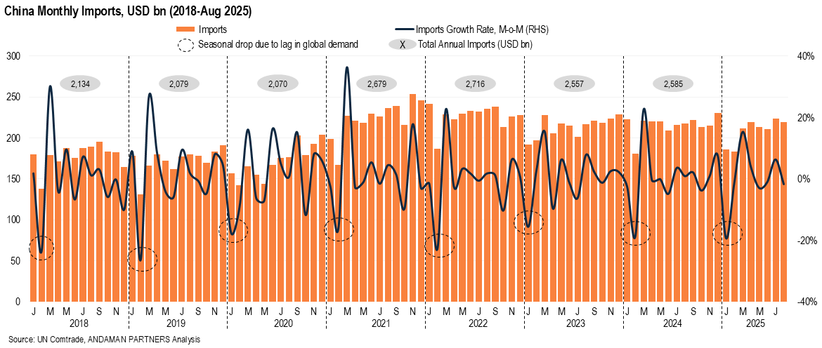 China’s monthly imports reached a record high (USD 254 billion) in November 2021. In the first eight months of 2025, however, China’s monthly import totals have been mainly in the USD 210-220 billion range. The aggregate total for January to August 2025 is slightly down year-on-year, down 2.3% compared to the same period in 2024.