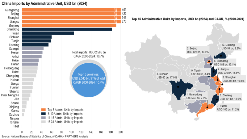 The ten administrative units whose imports had the fastest CAGRs from 2000-2024 were all located beyond the coastal belt in the central regions, led by Guangxi (CAGR of 20.1%), Jiangxi (18.2%), Henan (18.0%), Sichuan (17.9%) and Hainan (17.7%).