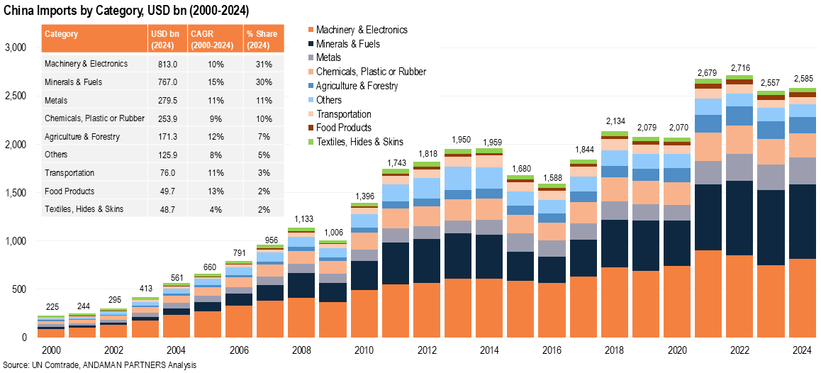 From 2000 to 2024, Minerals & Fuels was the fastest-growing import category with a CAGR of 15%, followed by Food Products (13%), Agriculture & Forestry (12%), Transportation (11%), Metals (11%) and Machinery & Electronics (10%). The categories with the slowest growth over this period were Textiles (4%) and Chemicals (9%).
