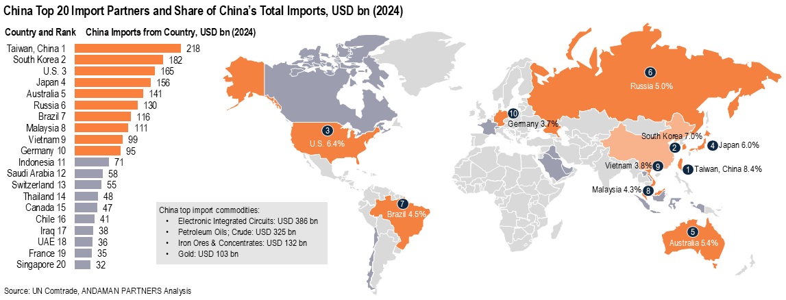 • China’s largest single import partner is Taiwan (China) with a share of 8.4% of total imports in 2024, followed by South Korea (7%) and the U.S. (6.4%).