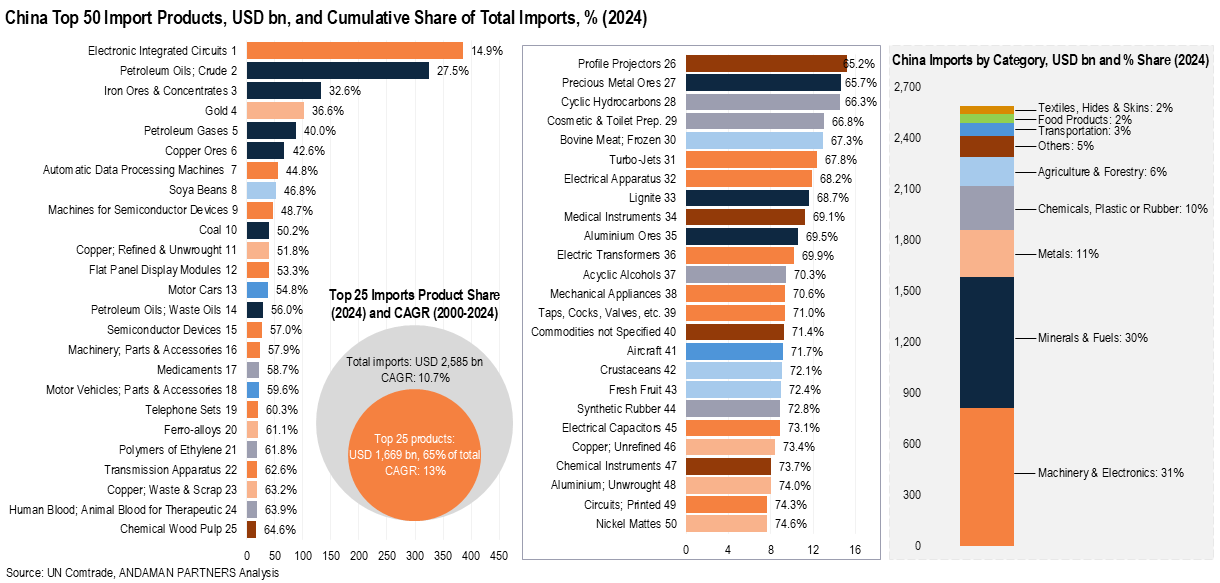 China’s import mix in 2024 was dominated by two categories: Machinery & Electronics (USD 813 billion, a share of 31%) and Minerals & Fuels (USD 767 billion, share of 30%). Just two products, electronic integrated circuits and crude petroleum oil, accounted for more than a quarter (27.5%) of China’s total imports in 2024.