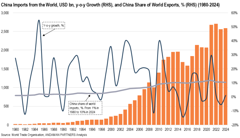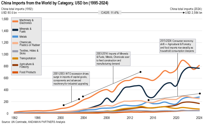 China’s integration into global trade is equally visible from the demand side. Although its exports receive more attention, China’s imports have played a central role in reshaping global commodity markets, industrial production systems and regional trade flows.