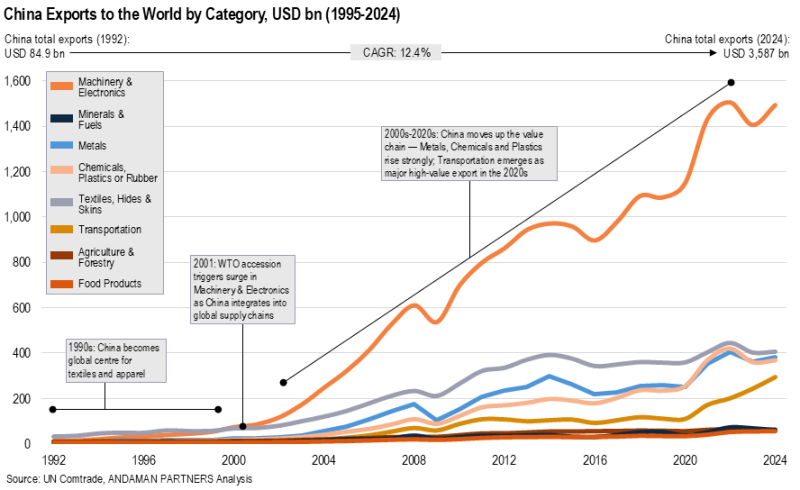 What began with labour-intensive goods gradually evolved into higher-value products as China developed a robust manufacturing base, expanded industrial clusters and fostered a broad supplier ecosystem. China developed full-spectrum manufacturing ecosystems from low-cost assembly to high-end components, capital equipment and advanced electronics.