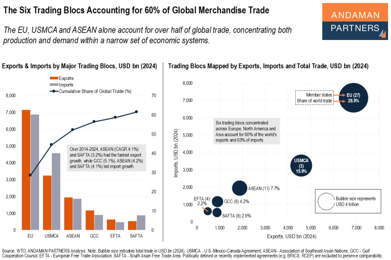 The EU, USMCA and ASEAN alone account for over half of global trade, concentrating both production and demand within a narrow set of economic systems.