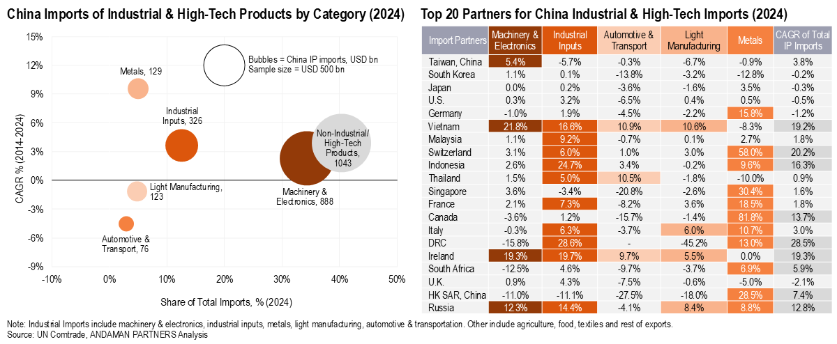 The category structure highlights an important structural feature of China’s role in global trade: imports are concentrated in upstream and midstream industrial inputs rather than finished consumer goods. High-value components, specialised machinery and advanced materials flow into China’s manufacturing ecosystem, where they are integrated into complex production systems before being exported or consumed domestically.