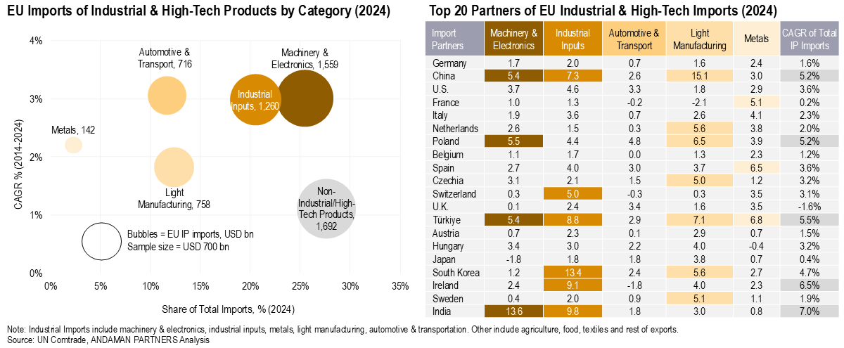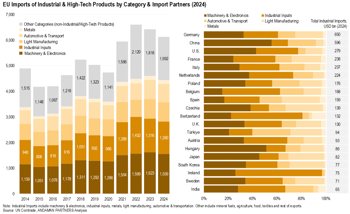 The EU represents the largest bloc of collective industrial demand globally. In 2024, EU merchandise imports exceeded USD 6 trillion, with industrial and high-tech goods accounting for the majority of this total. The scale of the European market makes it a central anchor of demand in the global industrial economy.