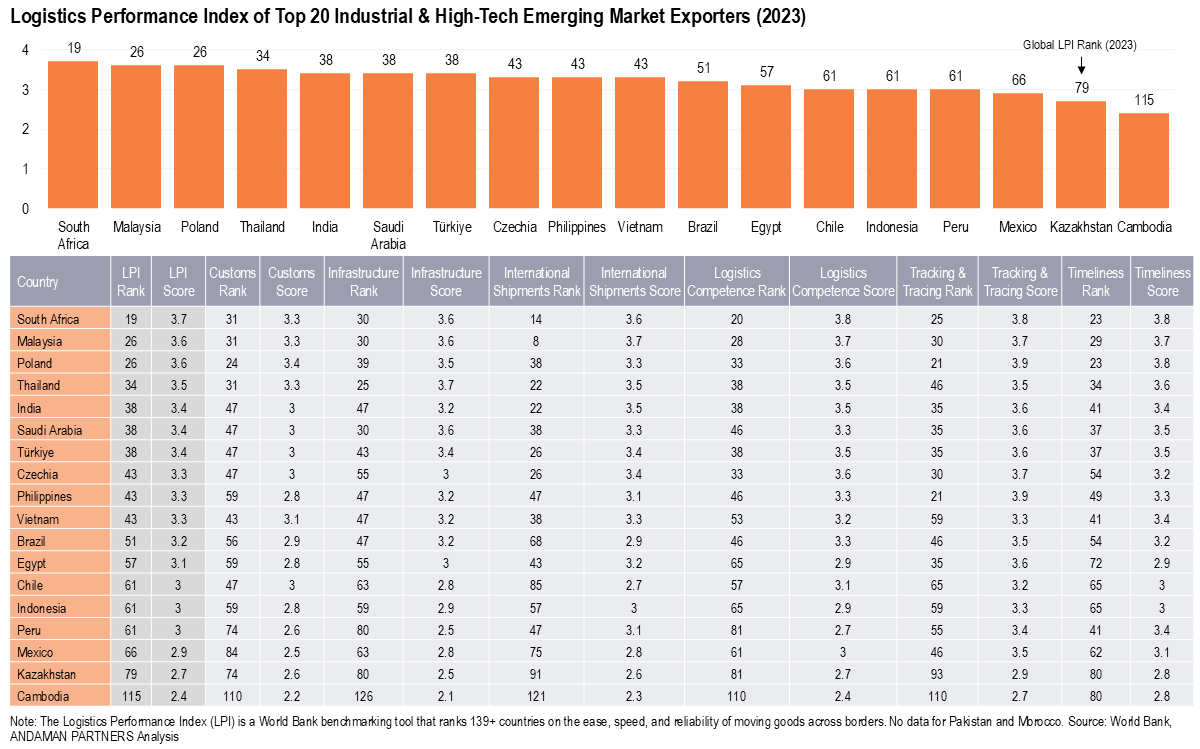 Across the 18 emerging-market industrial exporters with available data (Morocco and Pakistan are excluded due to missing LPI data), logistics performance varies significantly, ranging from near advanced-economy execution standards to systems that remain structurally constrained.