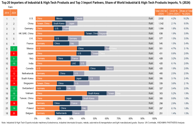 The U.S. remains the largest single industrial demand centre globally. In 2024, U.S. imports of industrial and high-tech products totalled approximately USD 2.6 trillion, representing the largest national market for globally traded industrial goods.