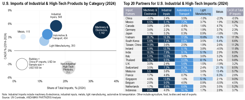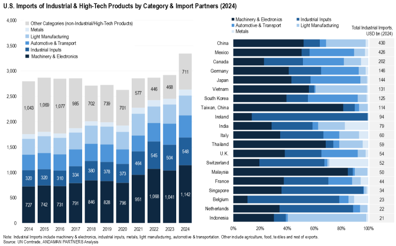 Supplier concentration remains significant but is evolving. In 2024, China and Mexico were effectively tied as the two largest suppliers, each exporting roughly USD 430 billion in industrial goods to the U.S. China remains deeply embedded across machinery, electronics and consumer-linked industrial goods. Mexico, however, plays an increasingly central role in automotive, transportation equipment and integrated North American manufacturing supply chains, reflecting the continued deepening of regional production networks.