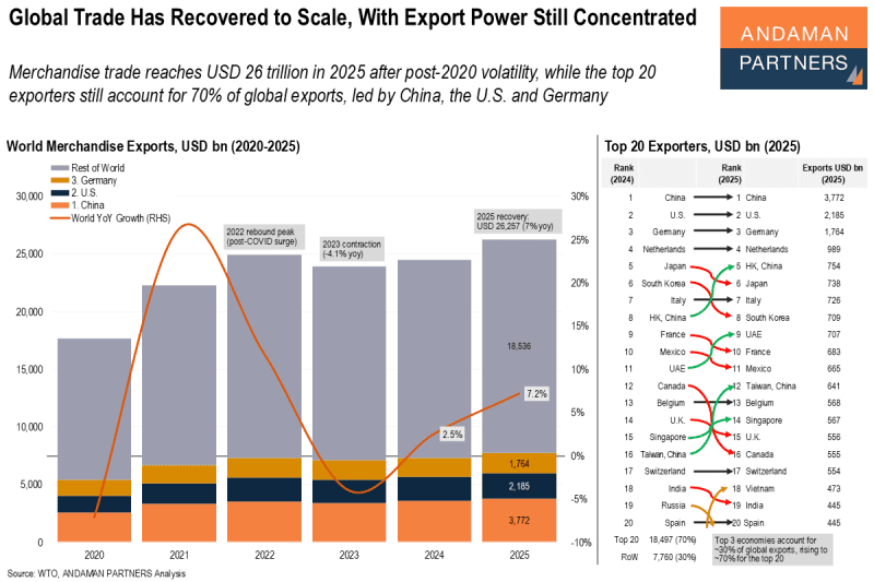 Merchandise trade reaches USD 26 trillion in 2025 after post-2020 volatility, while the top 20 exporters still account for 70% of global exports, led by China, the U.S. and Germany.