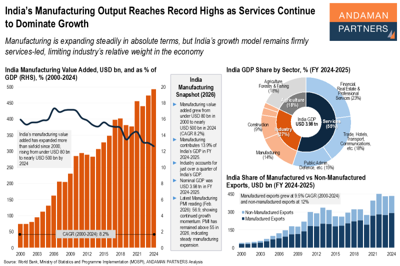 Manufacturing is expanding steadily in absolute terms, but India’s growth model remains firmly services-led.